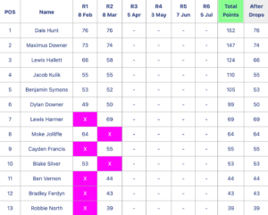 - Max again took 2nd place in Round 2 after continuing his streak of finishing 1st, 2nd and 3rd across the Round. It was looking like he might take Round victory for a while but an unfortunate loss of the rear on a corner left him chasing Dale once again. Unlucky Max, keep fighting and it will come!